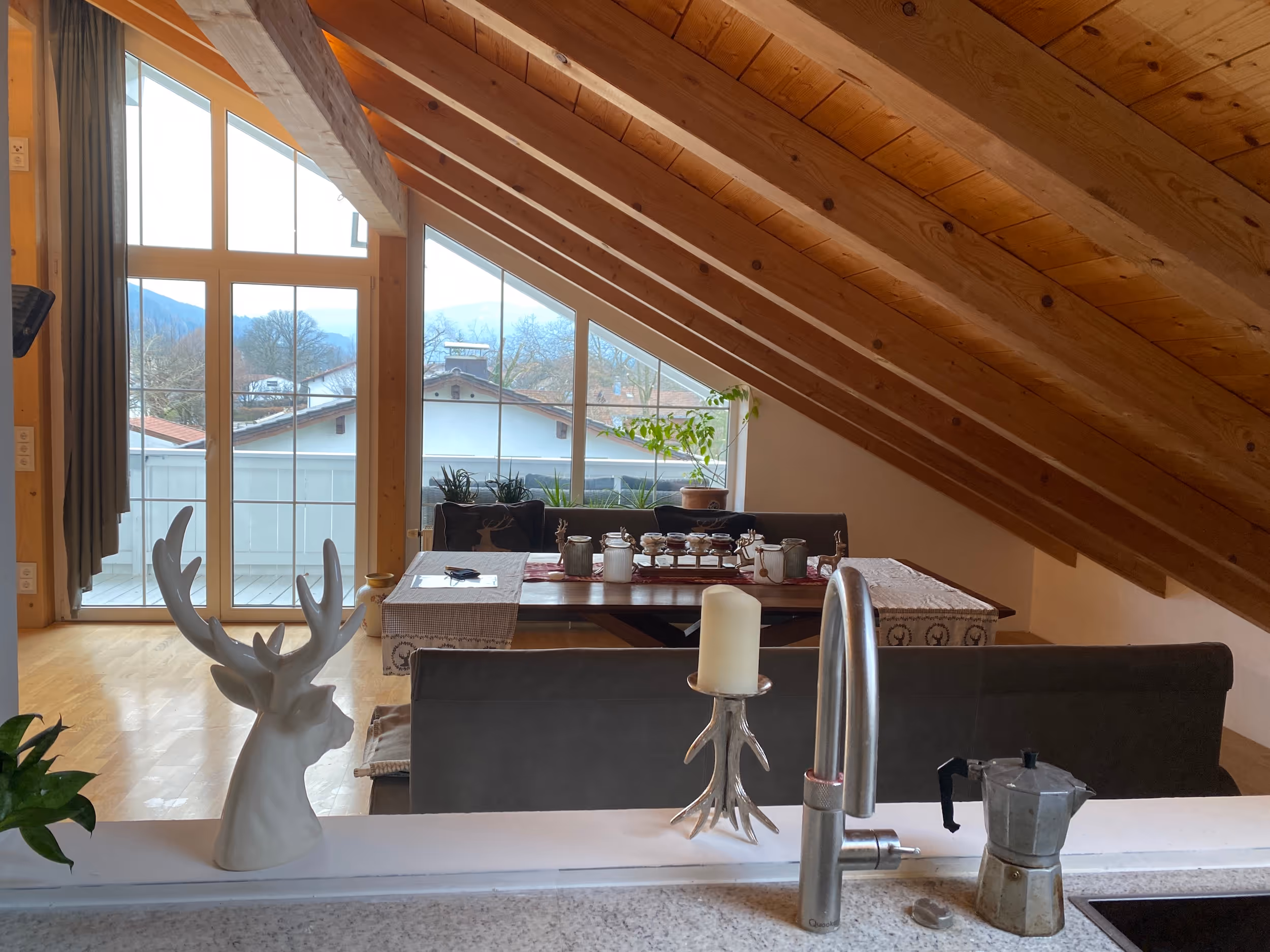 Stilvoll und gemütlich wohnen mit alpenländischem Flair – dazu gehört sicherlich der moderne Sichtdachstuhl der diese Wohnung zu etwas Besonderen macht.
