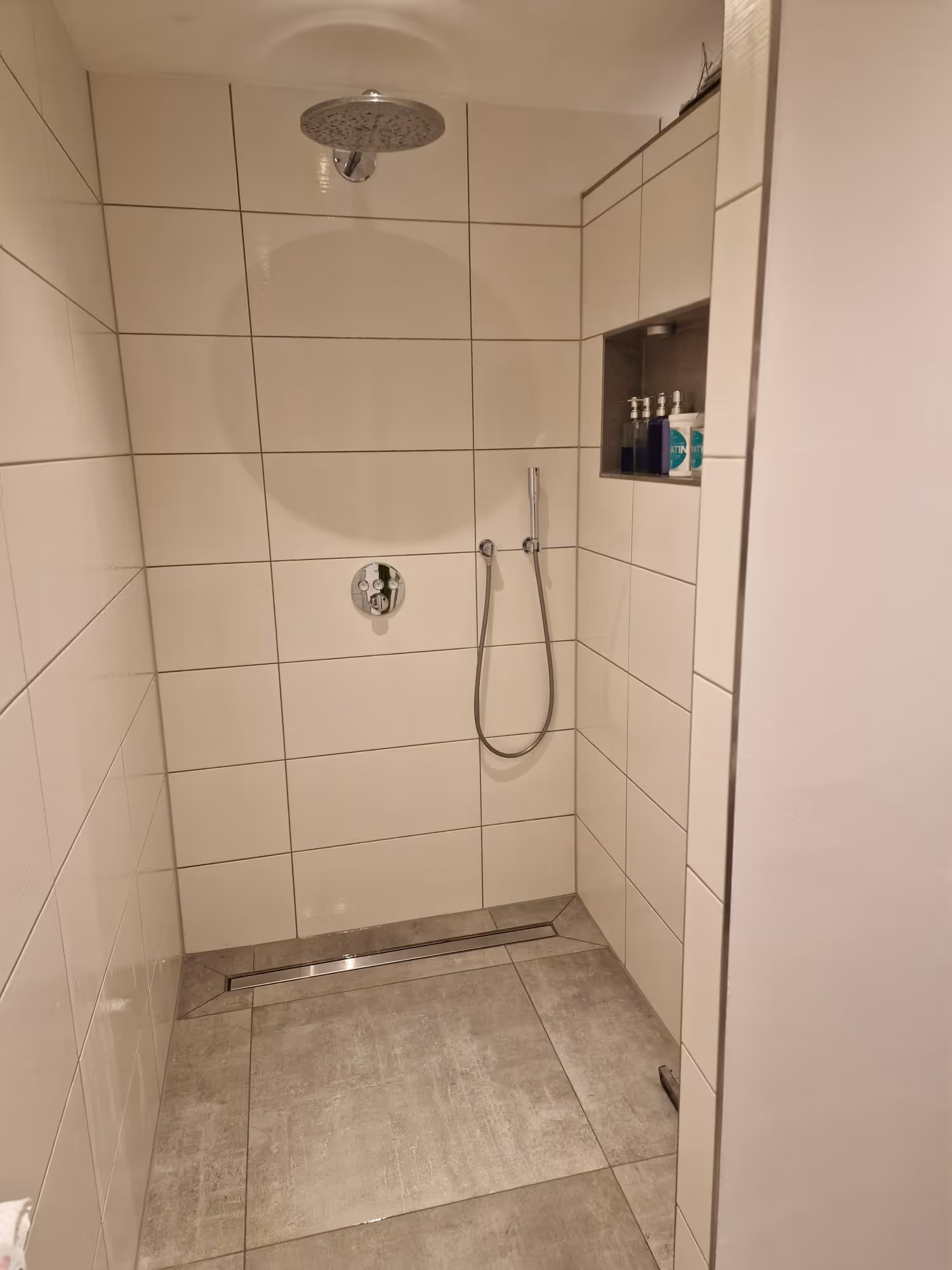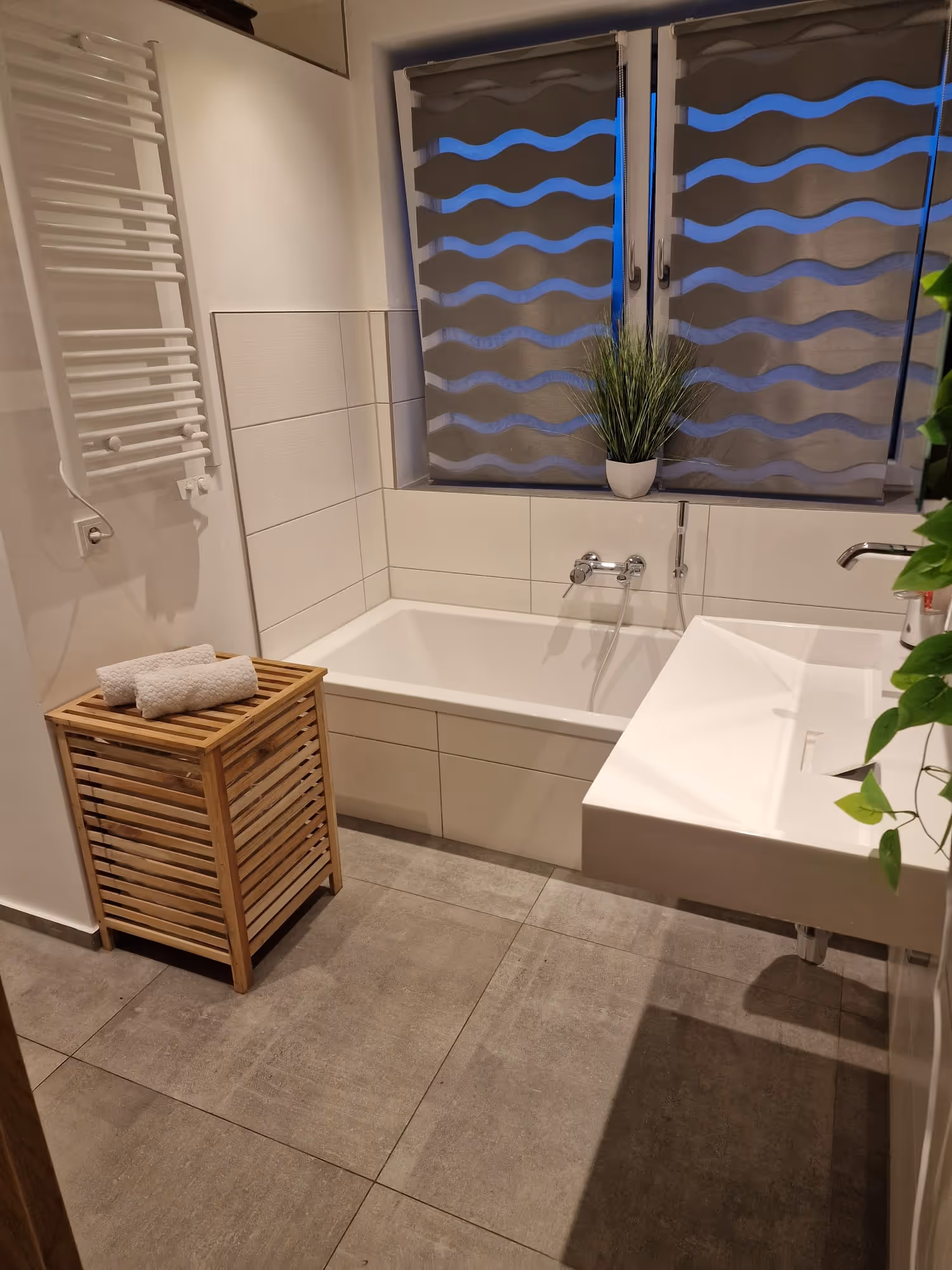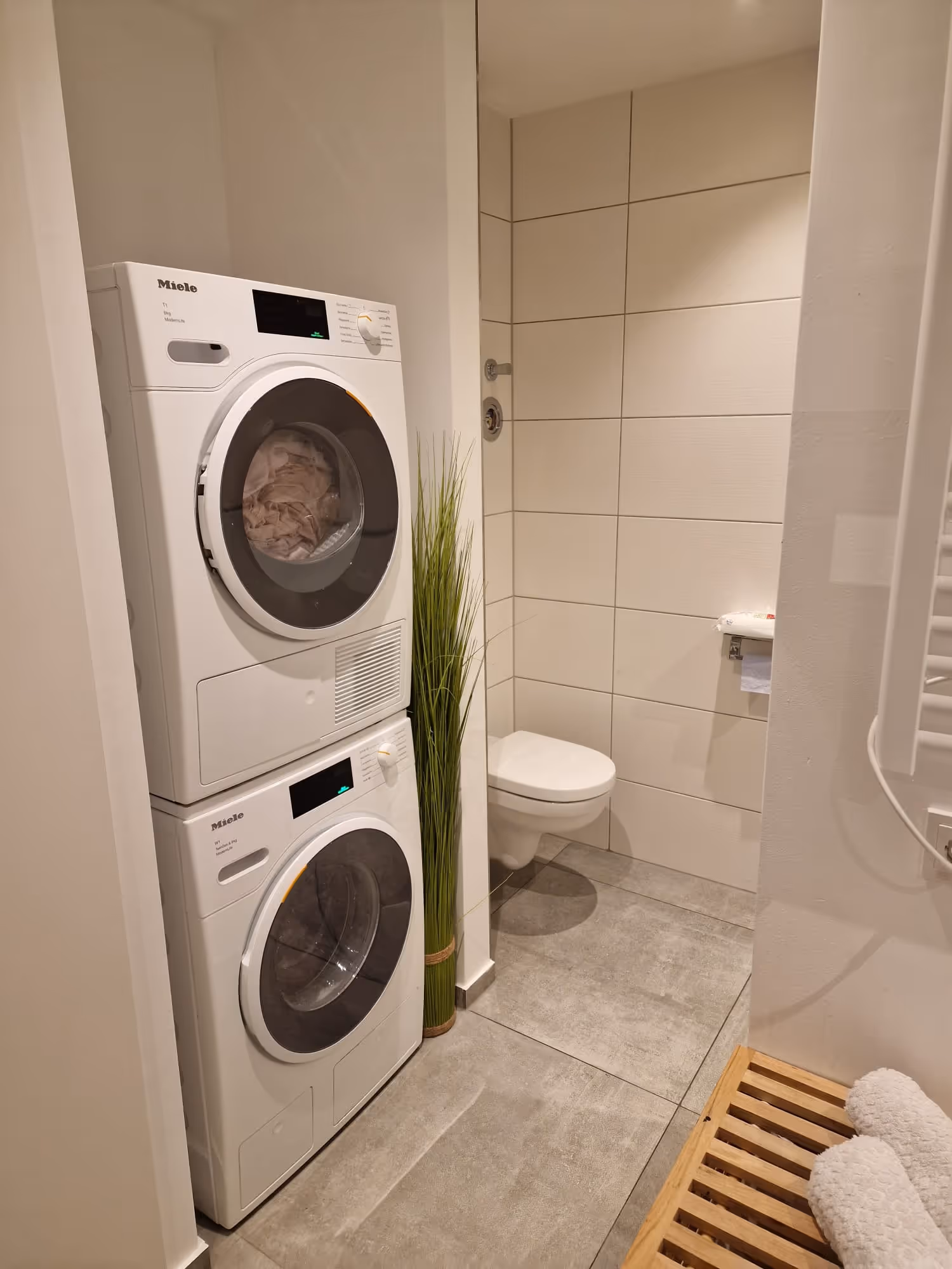 Das Highlight der Wohnung ist das moderne Badezimmer. ausgestattet mit Wanne, großzügiger, begehbarer Dusche und WC. Der Bereich für Waschmaschine und Trockner wurde gesickt gelöst. Ein eingebauter Wandschrank ist der ideale Stauraum für Waschmittel, Duschgels etc..