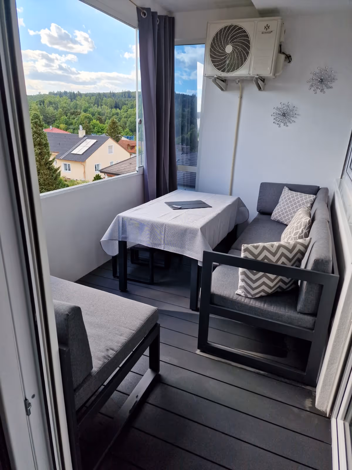 Der Wohn-/Essbereich ist offen gehalten und beinhaltet eine moderne, hochwertige Einbauküche mit großzügigen Kochfeld. Von hier aus gelangen Sie angrenzend zu einem der sonnigen Balkone. Da der Balkon mit Glasscheiben zu schieben ausgestattet ist, lässt sich der gemütliche Bereich auch bei Regenwetter nutzen.