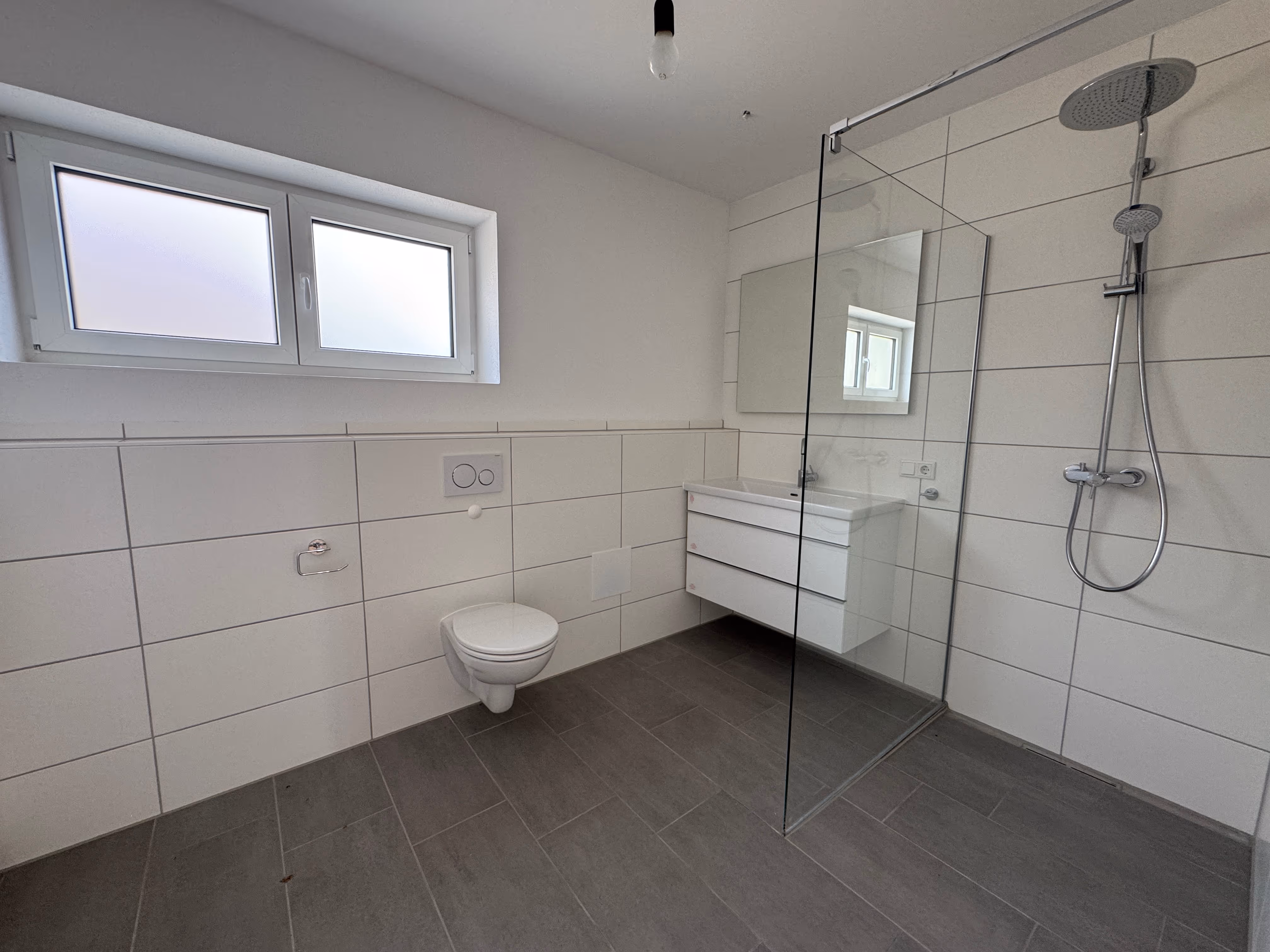 Das separate Schlafzimmer bietet ausreichend Platz für Ruhe und Rückzug. Ein echtes Highlight ist das elegante Badezimmer mit einer großzügigen, bodentiefen Dusche und stilvollem WC – modern, funktional und hochwertig ausgestattet.