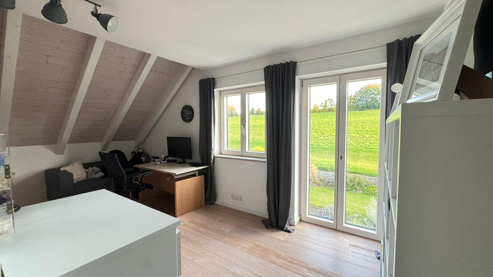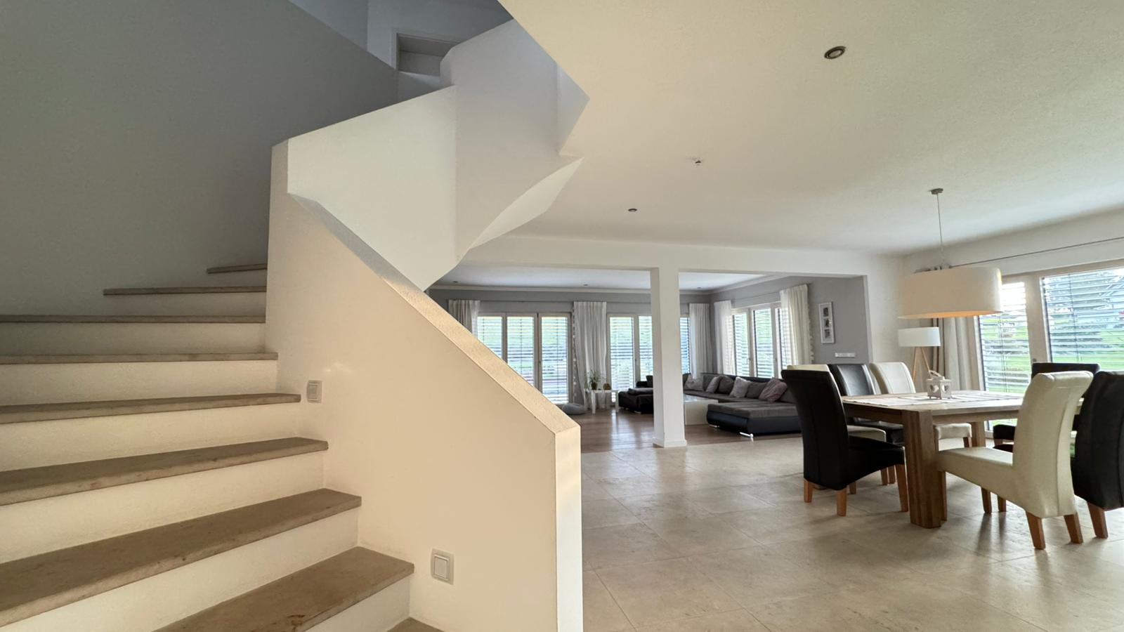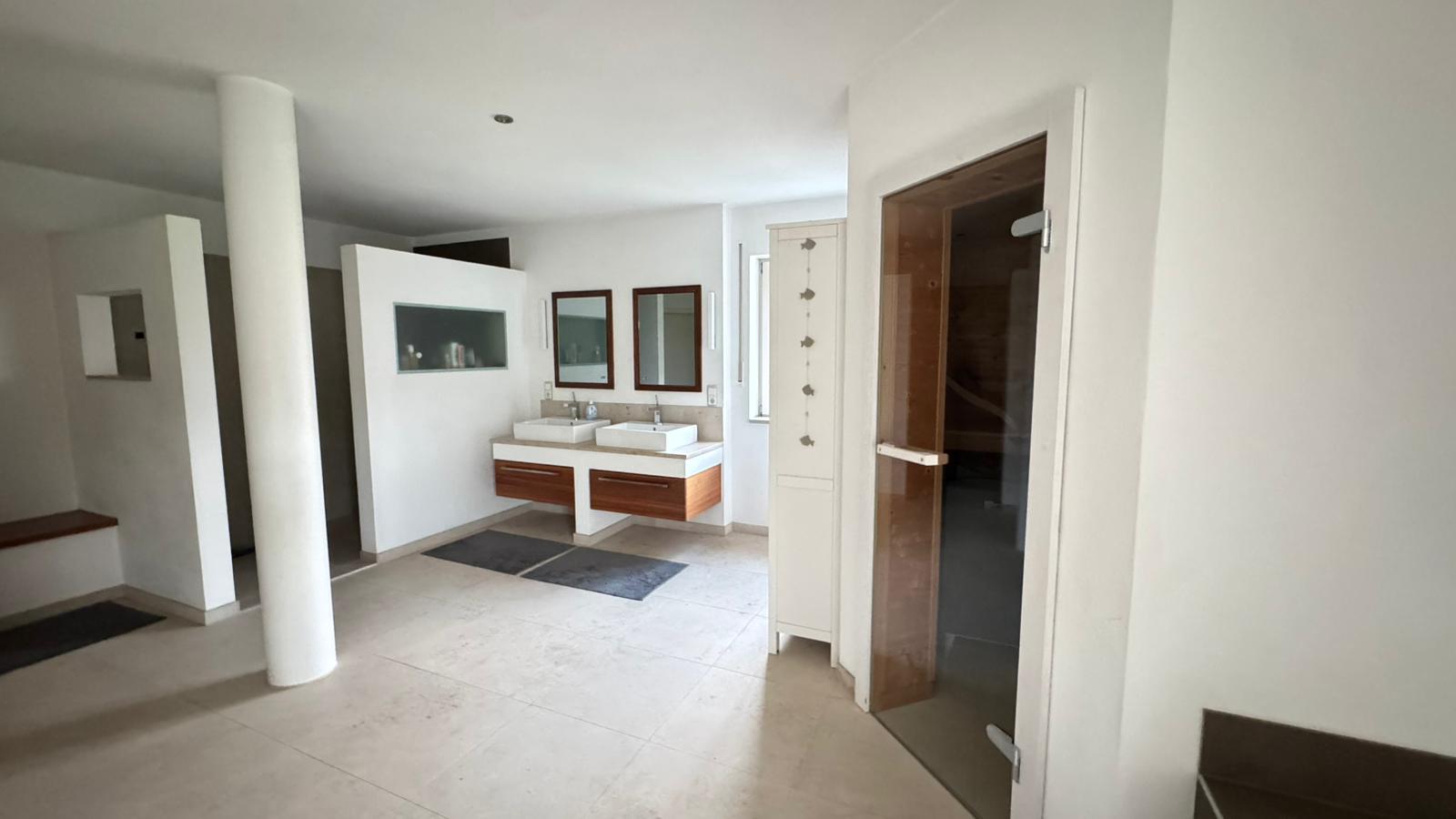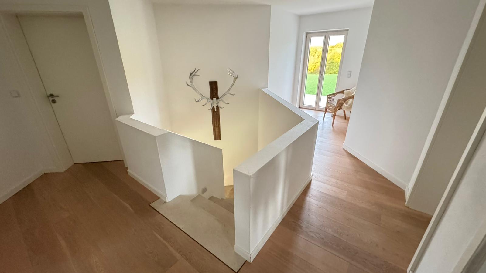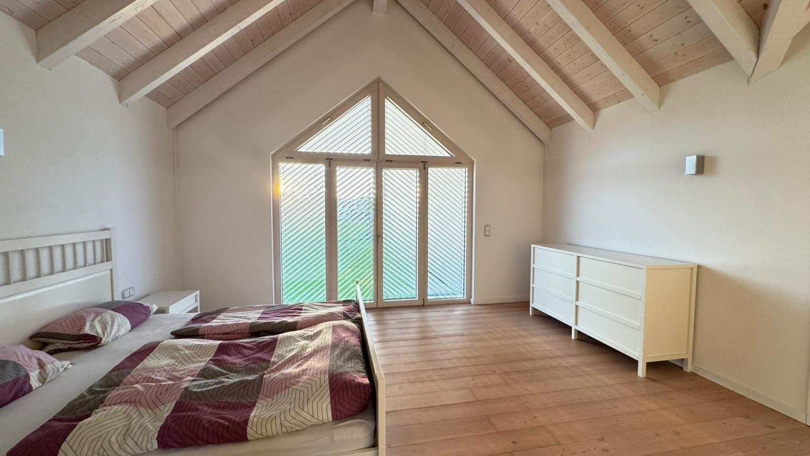 Ein architektonisches Highlight ist die geschwungene Treppe, die Sie elegant ins Obergeschoss führt. Hier erwarten Sie ein stilvolles Elternschlafzimmer mit eigener Ankleide sowie zwei charmante Kinderzimmer. Die Schlafzimmer beeindrucken zum Teil mit einem offenen Sichtdachstuhl, welcher für eine ganz besondere Wohnatmosphäre sorgt. Das Bad selbst bietet Wellness pur: eine Badewanne, eine großzügige begehbare Dusche sowie eine Sauna für bis zu vier Personen – Ihr ganz privater Rückzugsort.