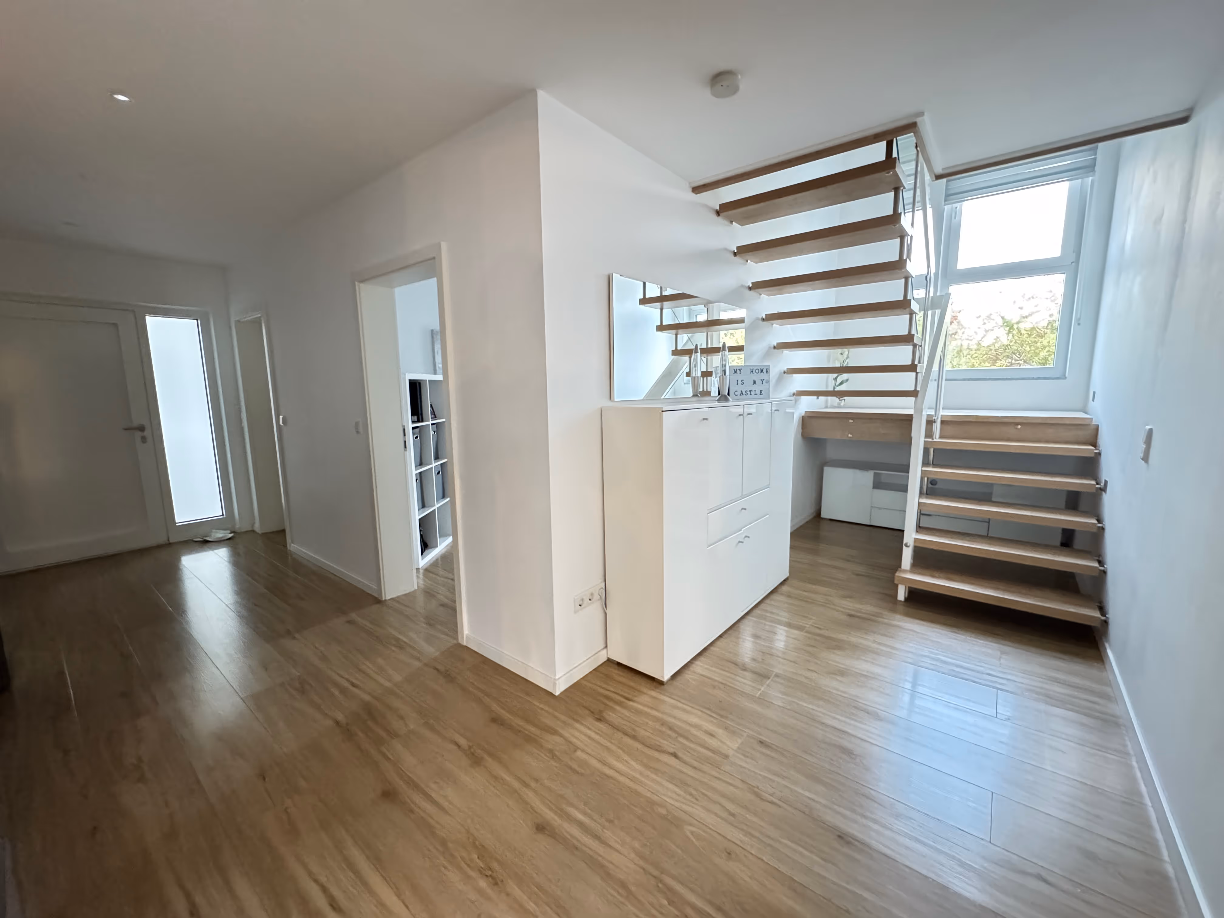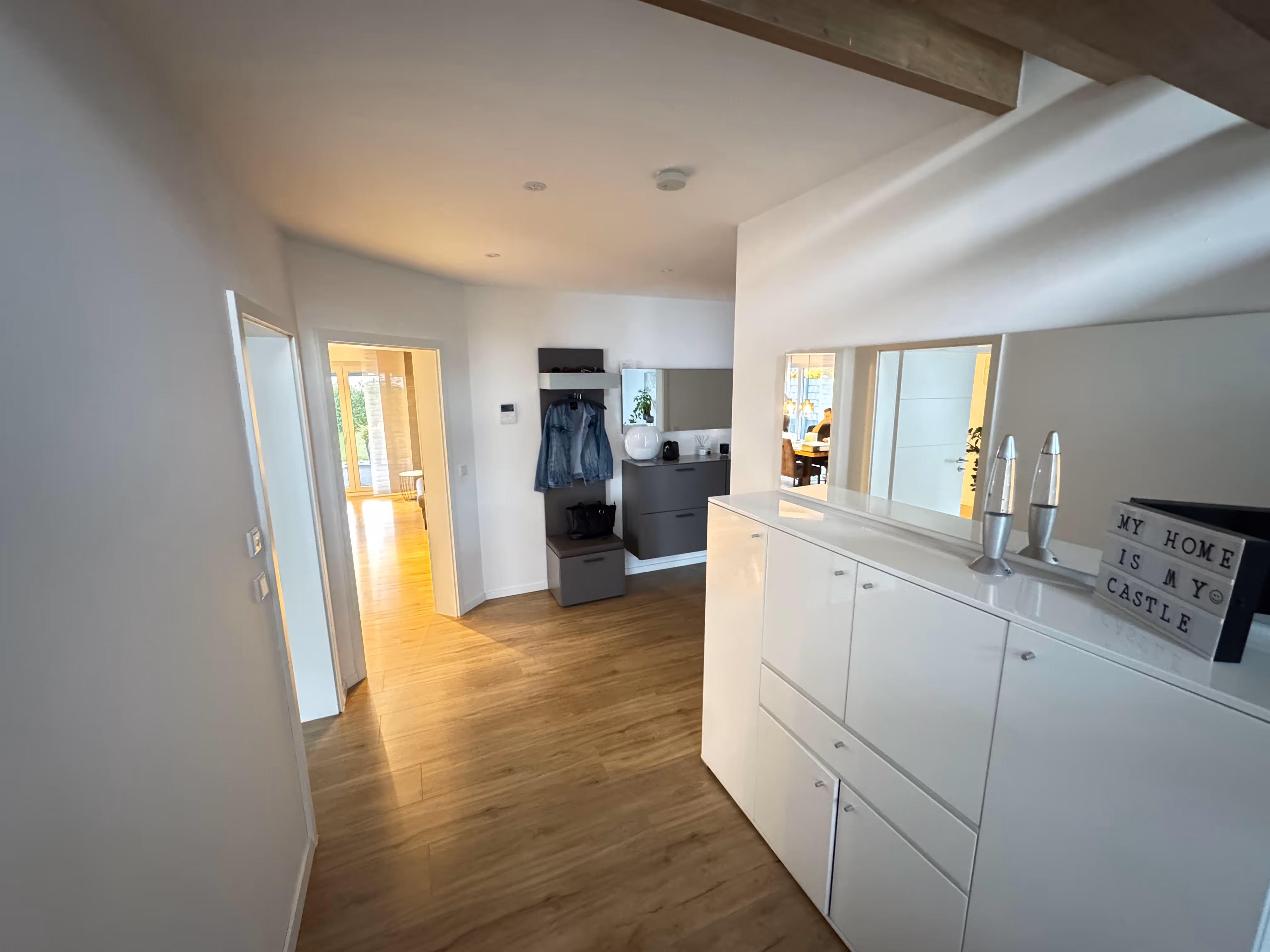 Schon beim Betreten des Hauses spürt man die Großzügigkeit und das moderne Wohngefühl. Die weitläufige Diele empfängt Sie mit offenem Blick in den Wohnbereich und schafft sofort ein Gefühl von Zuhause.
