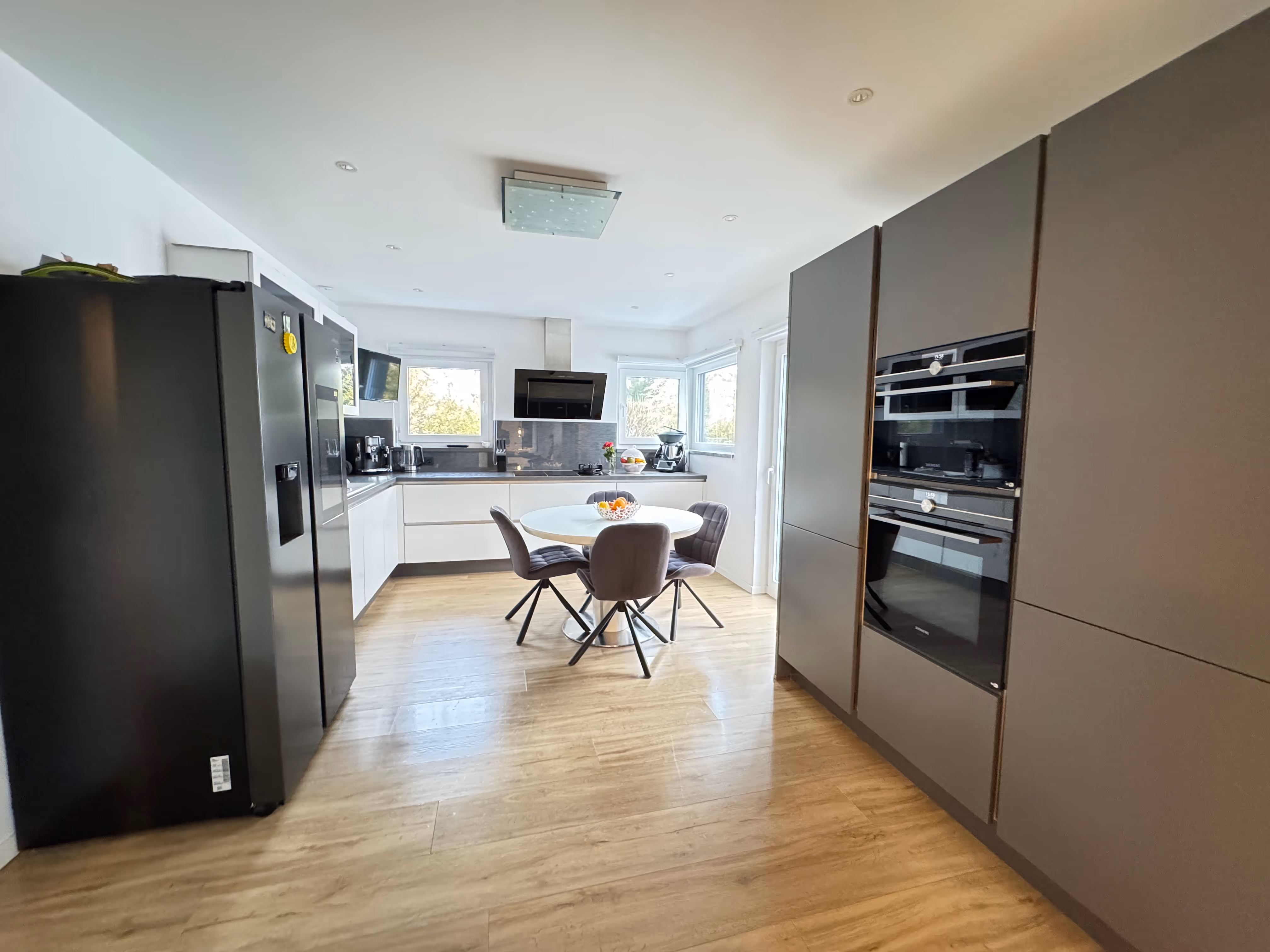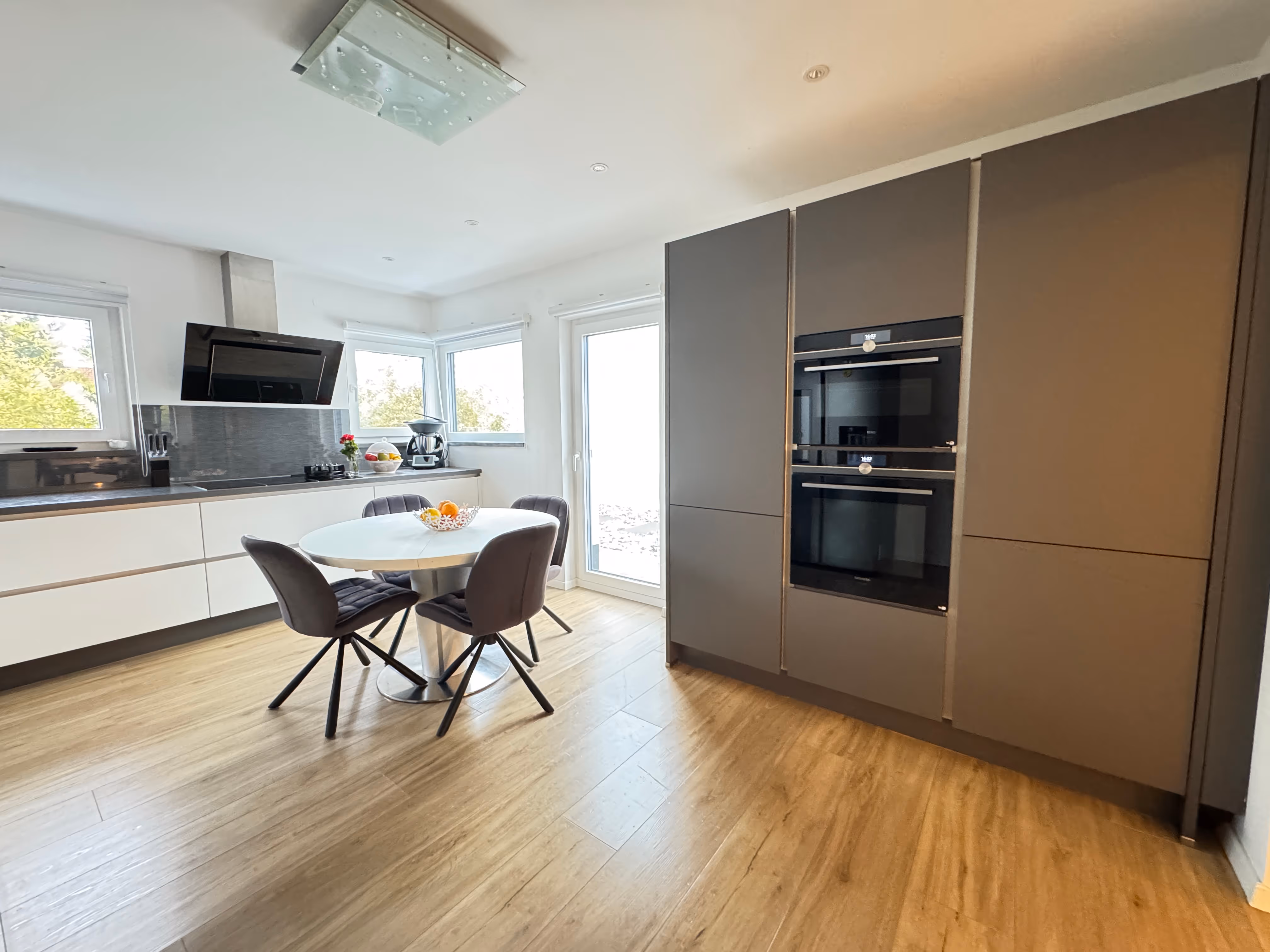 Der lichtdurchflutete Wohn- und Essbereich mit bodentiefen Fenstern verbindet stilvolles Wohnen mit höchstem Komfort – hier genießen Sie den freien Blick auf die Terrasse, in den Garten und den fließenden Übergang nach draußen. Die angrenzende, hochwertige Einbauküche überzeugt mit eleganten Fronten, moderner Technik und einer klaren Linienführung – ideal für alle, die Kochen und Design gleichermaßen lieben.