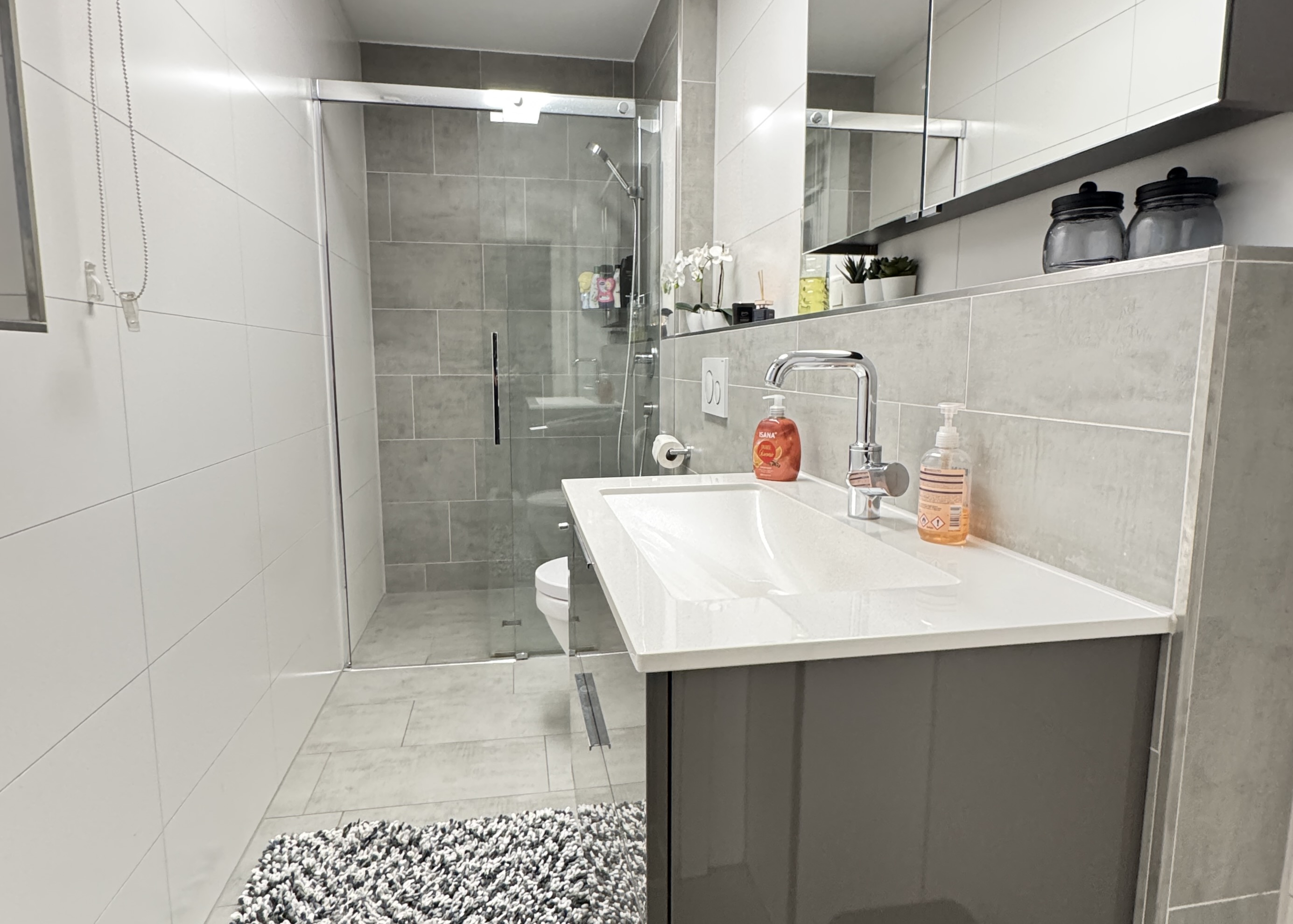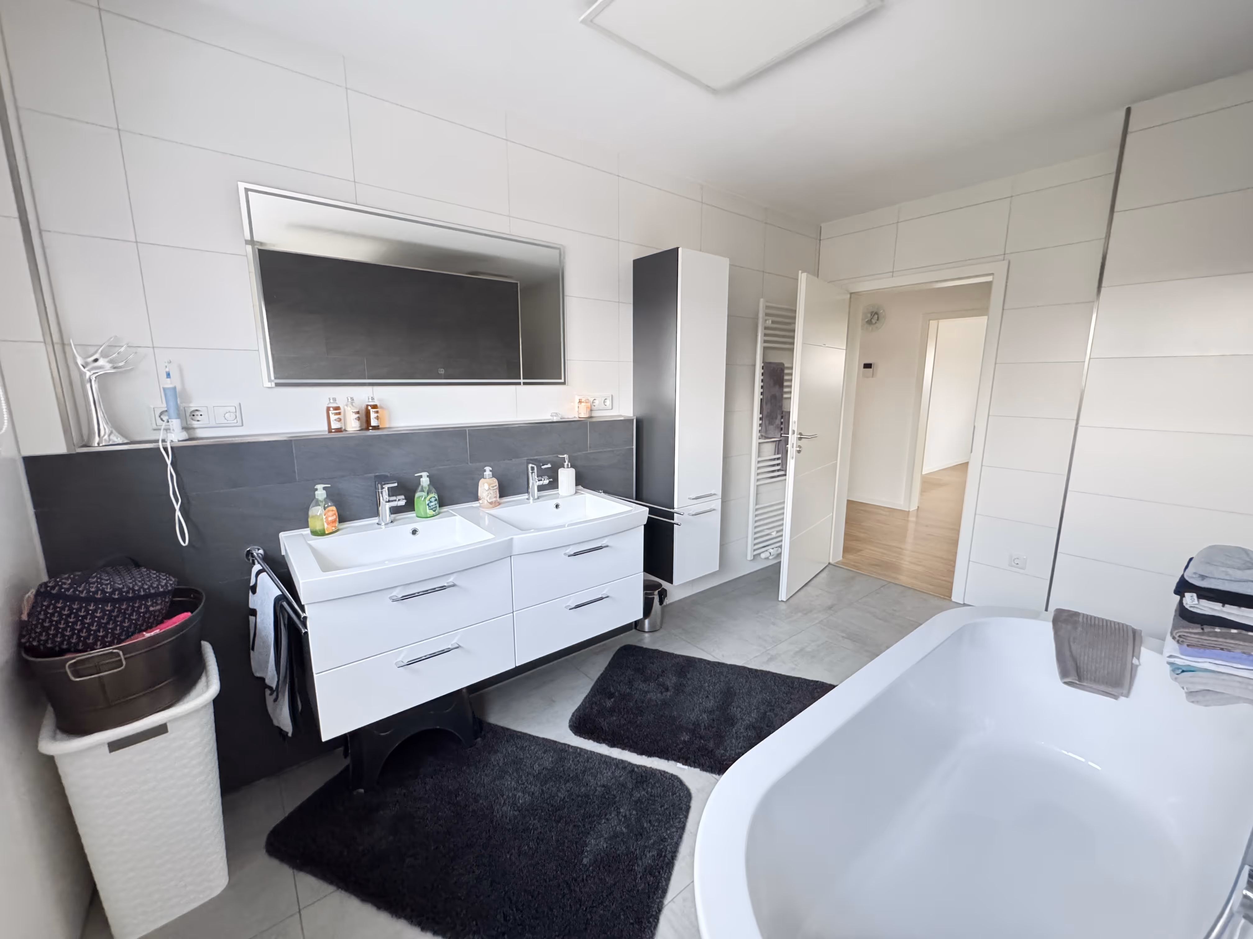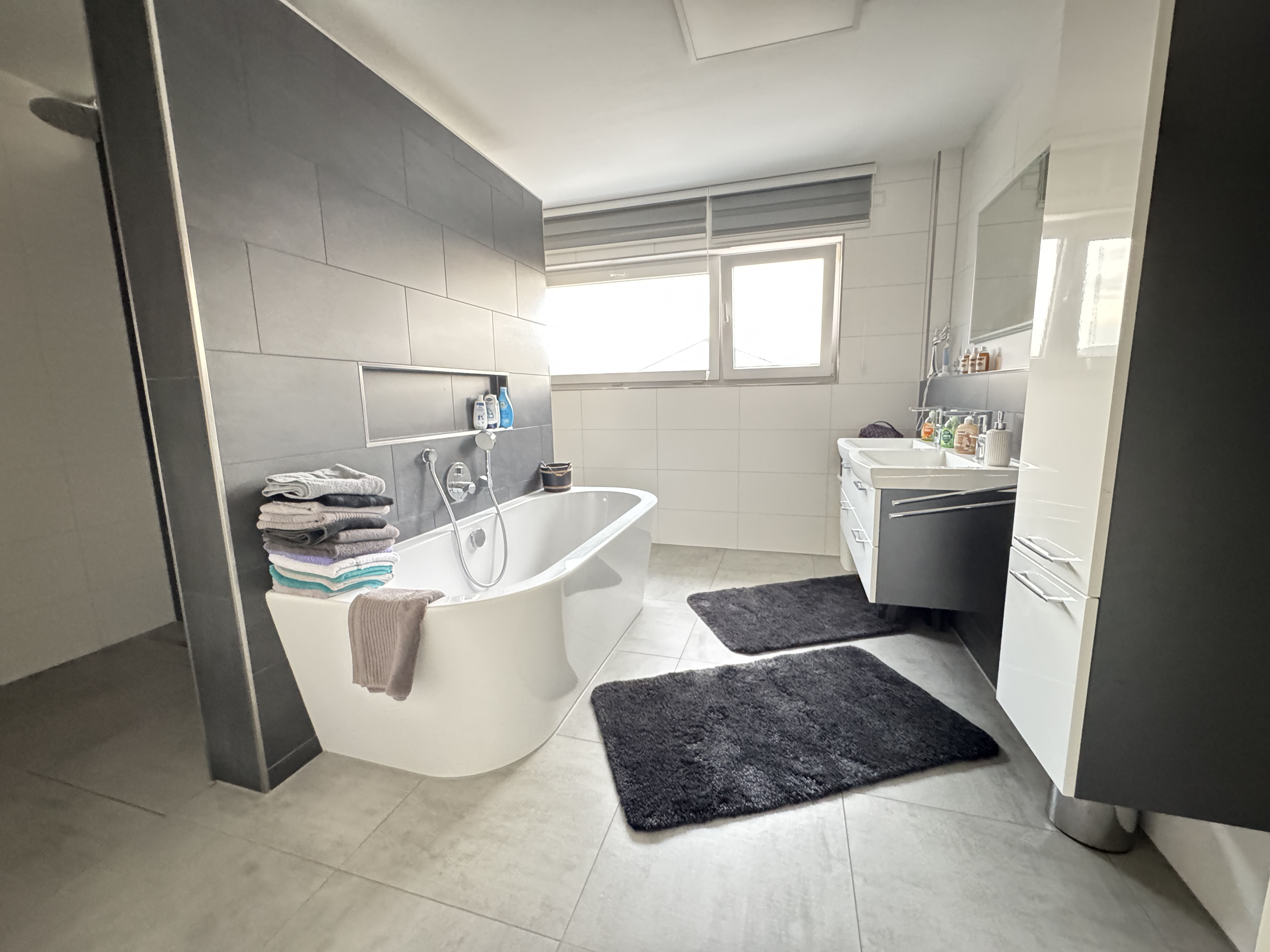 Ein echtes Highlight ist das elegante Badezimmer: Es beeindruckt mit einer eleganten Badewanne, einer bodentiefen Dusche und einer Ausstattung, die Modernität und Wohlfühlcharakter perfekt vereint.